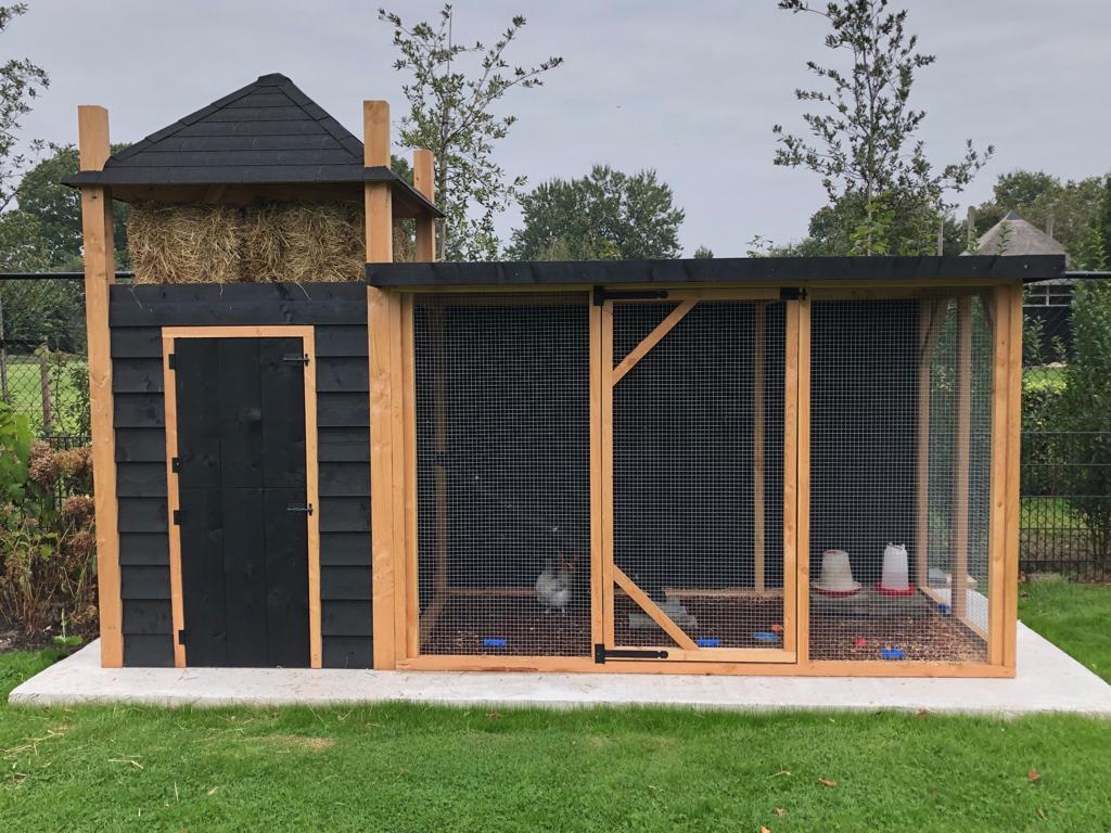 Word geleverd met zitstokken, legnesten en hooibalen.